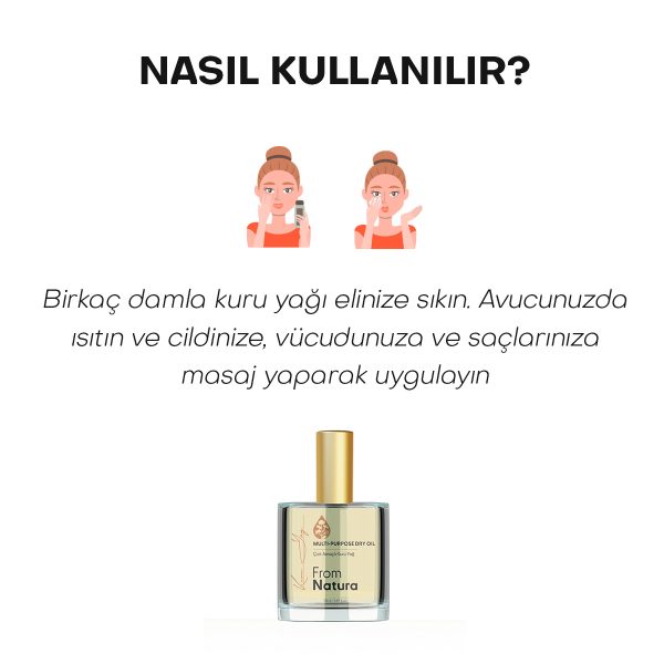 Birkaç damla elinize sıktığınız çok amaçlı kuru yağı avucunuzda ısıttıktan sonra tüm vücudunuza/saçlarınıza nazikçe masaj yaparak uygulayınız. Çok amaçlı kuru yağ’ı yüzünüzde, vücudunuzda ve saçlarınızda kullanabilirsiniz.