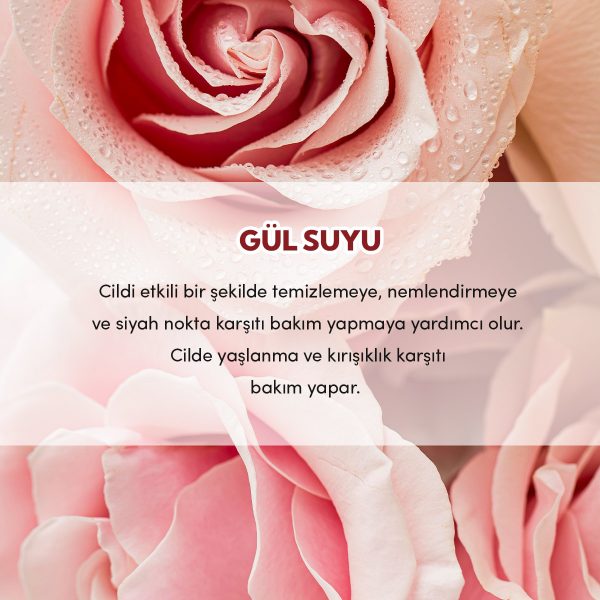 Tam mevsiminde toplanan gül yapraklarından, geleneksel yöntemlerle ve gül yağı ayrıştırılmadan elde edilir. Cilde ferahlık ve nem kazandırır, kuruluğa karşı bakım sağlar. Tüm cilt tiplerine uygundur.