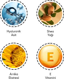 Hyaluronic Acid enhances the skin’s moisture retention capacity, providing long-lasting hydration. Shea Butter nourishes, softens, and moisturizes the skin. Arnica Extract helps protect the skin against environmental factors and keeps it feeling fresh. Vitamin E supports the skin against dryness caused by external stressors.